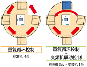 標(biāo)準(zhǔn)機(jī)采用重復(fù)循環(huán)方式,力求實(shí)現(xiàn)各空壓機(jī)運(yùn)轉(zhuǎn)時(shí)間和啟動(dòng)次數(shù)的均衡化。 而變頻機(jī)作為負(fù)荷控制機(jī),在恒壓下,與使用空氣量相匹配的理想的運(yùn)行狀況下進(jìn)行控制。 |